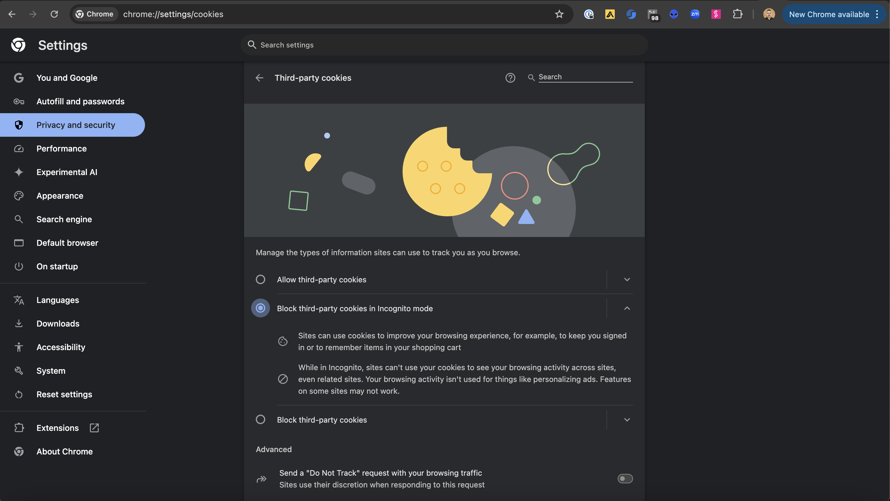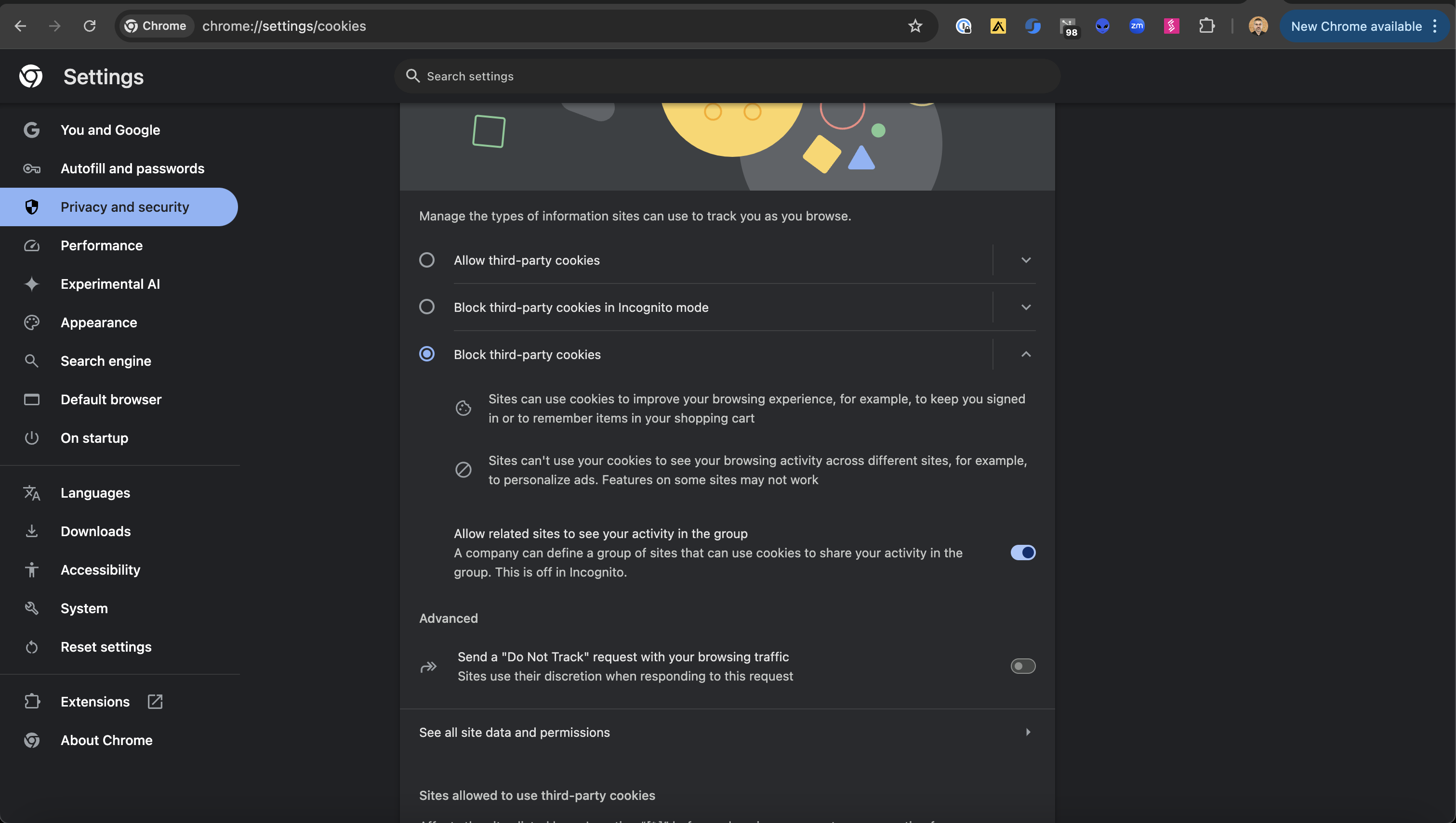 To determine your current settings for Google Chrome go to <chrome://settings/cookies> in your browser. You can use the link directly or navigate through Settings -> Privacy and Security -> Third Party Cookies.