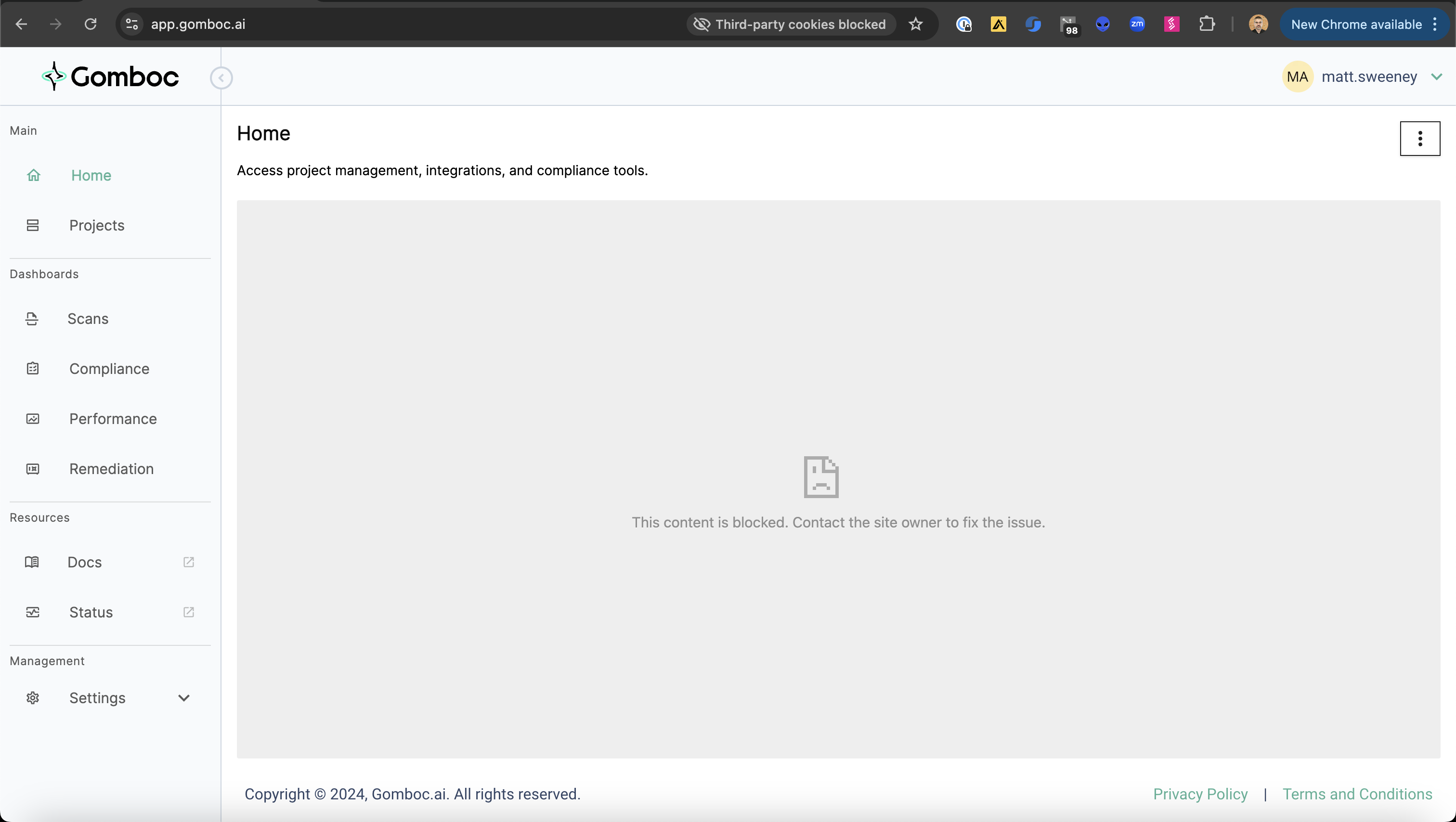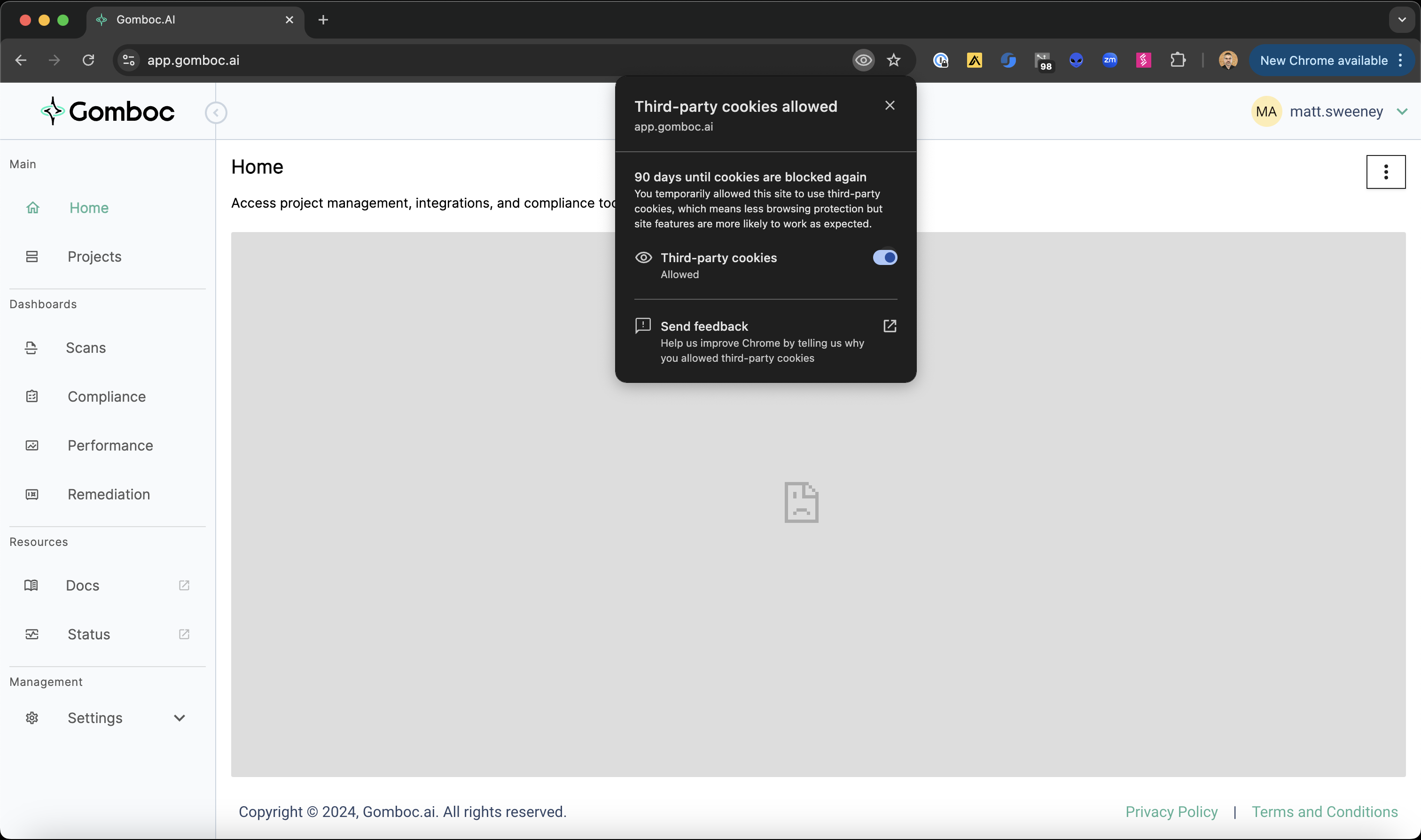 Once third-party cookies are allowed, then the Gomboc dashboard loads properly.